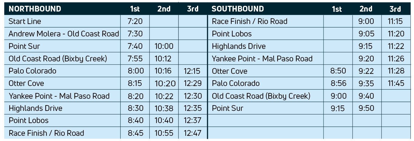 Northbound:— Travelers must be north of the Big Sur Post Office by 5:45am • All northbound travelers must pass Carmel River Bridge by 7am • Residents entering Highway 1 from a driveway or access road (east side only) will be allowed to join in at the back of a caravan.